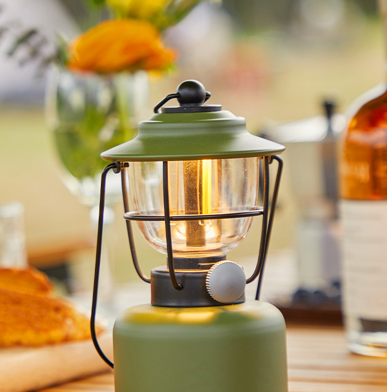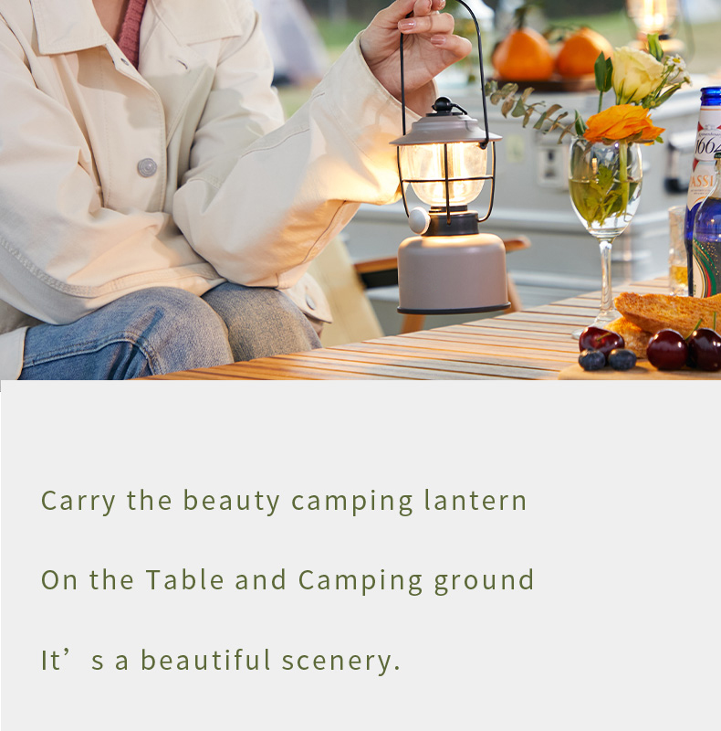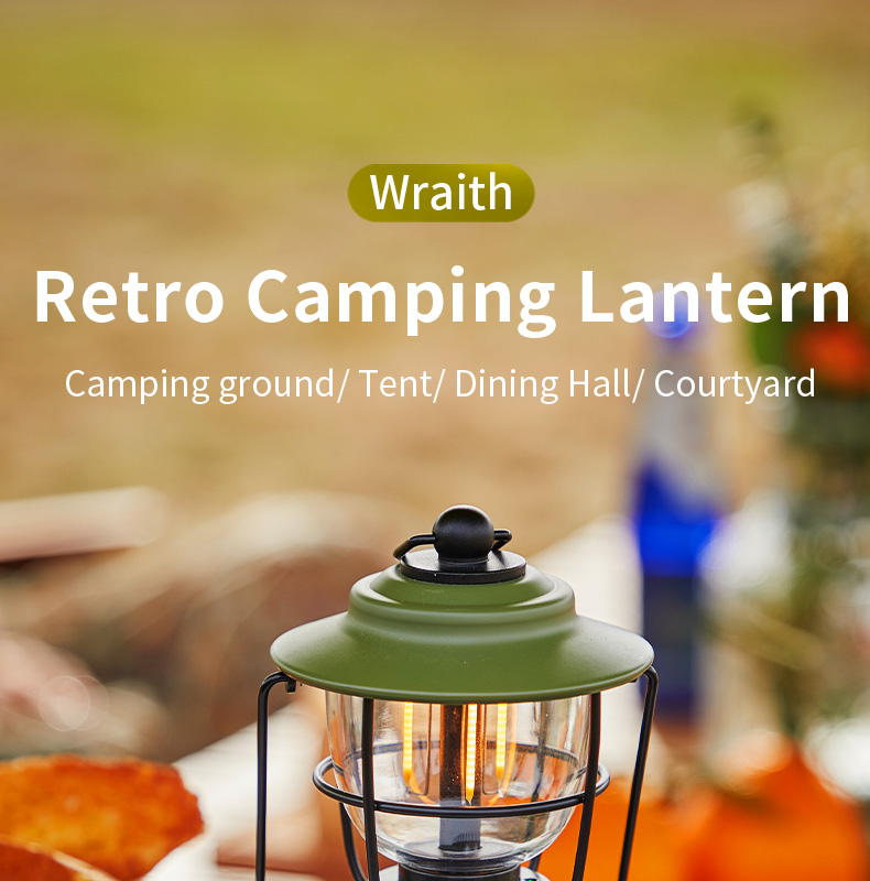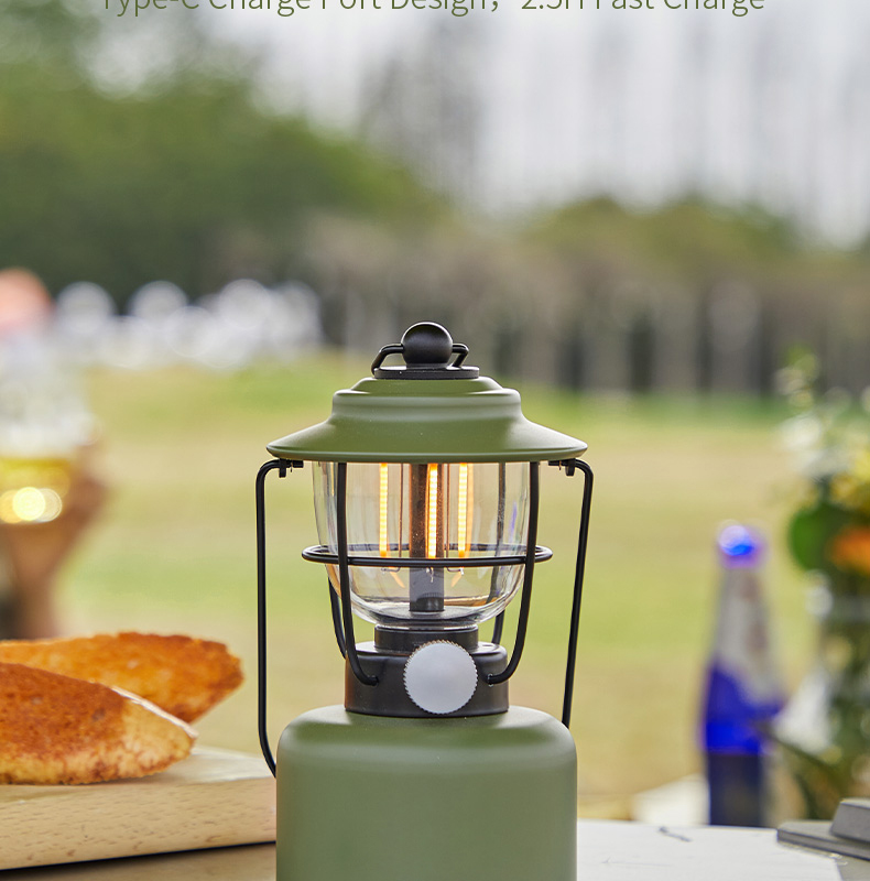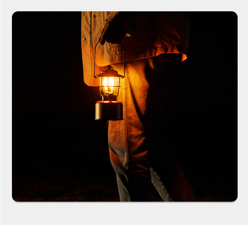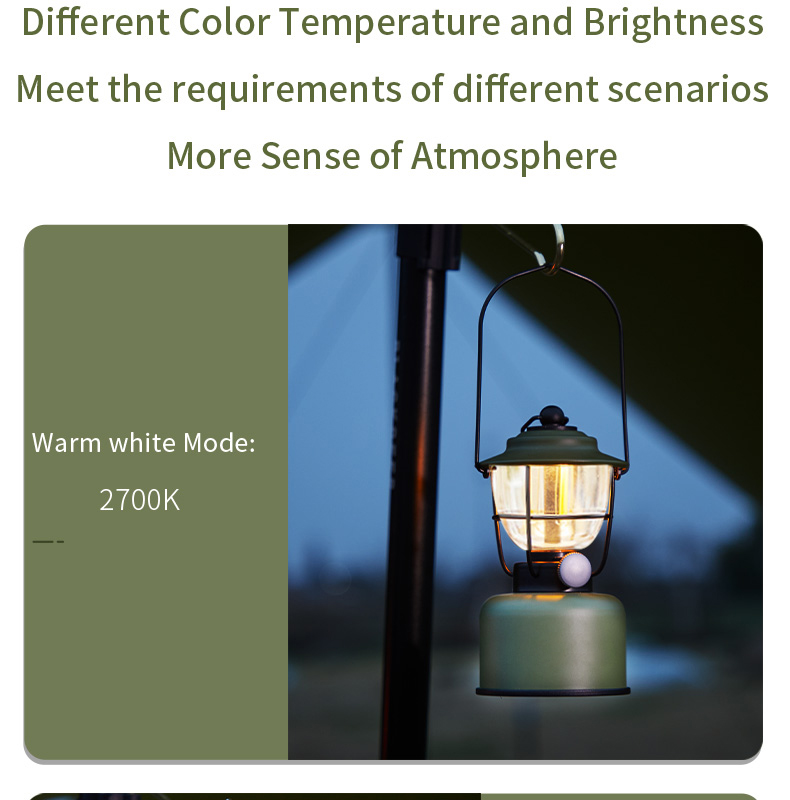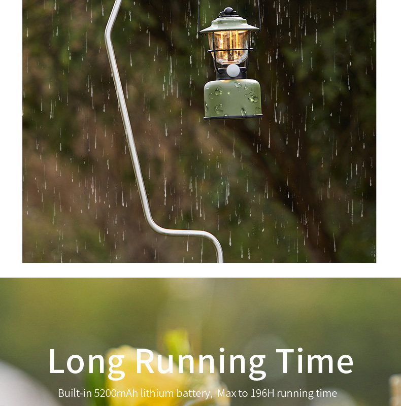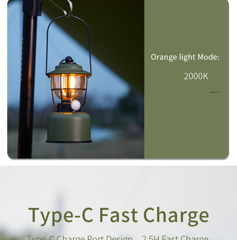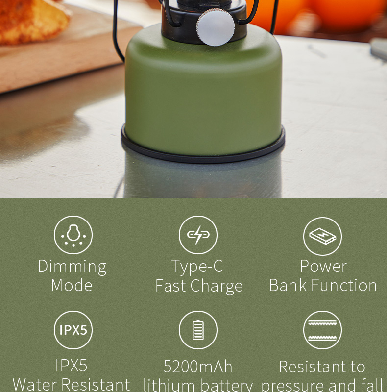Multi-functional retro camping lantern featuring dual lighting modes (2000K orange light/2700K warm white), adjustable dimming, and IPX5 water resistance. Built with durable construction resistant to pressure and falls, powered by 5200mAh lithium battery with Type-C fast charging and convenient power bank functionality.