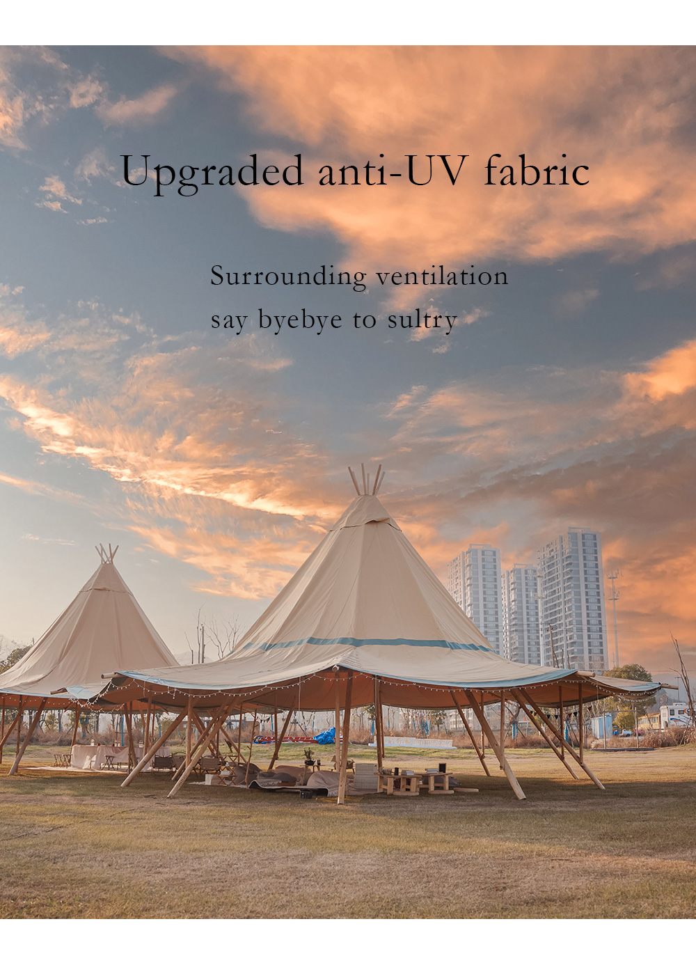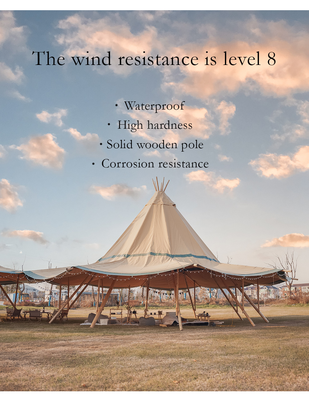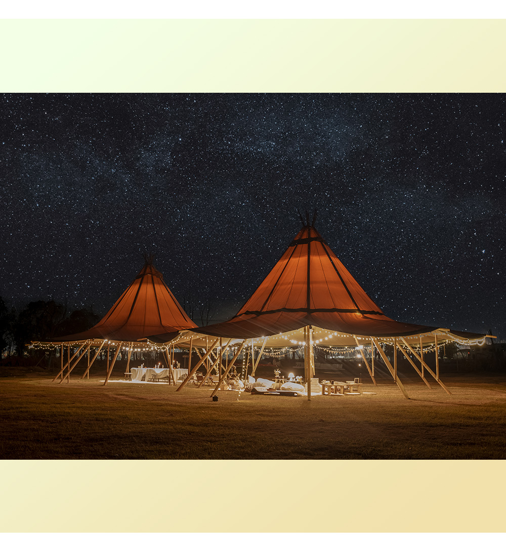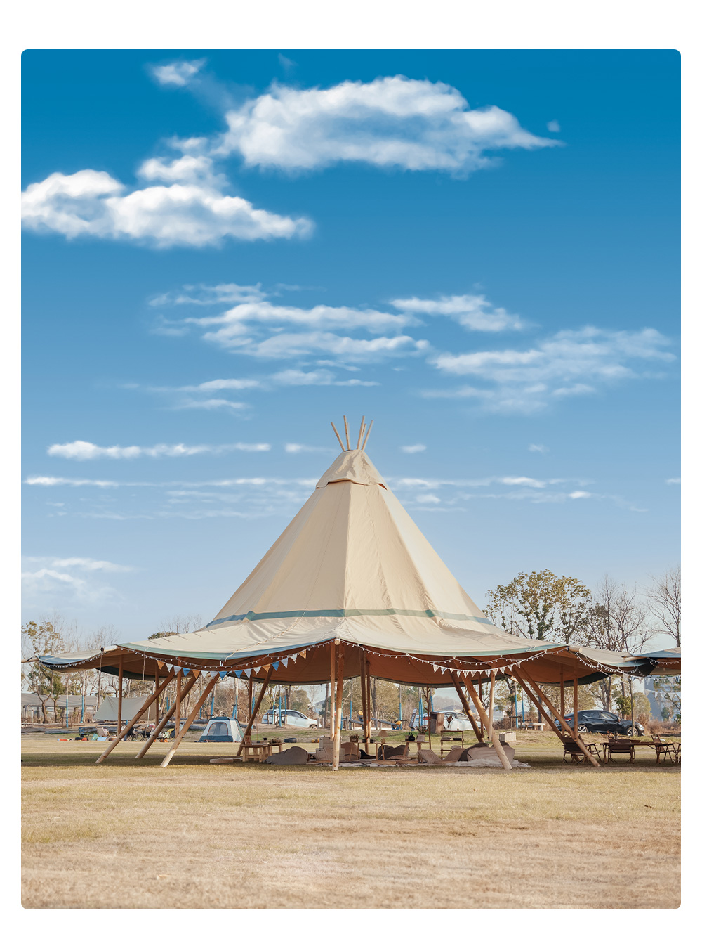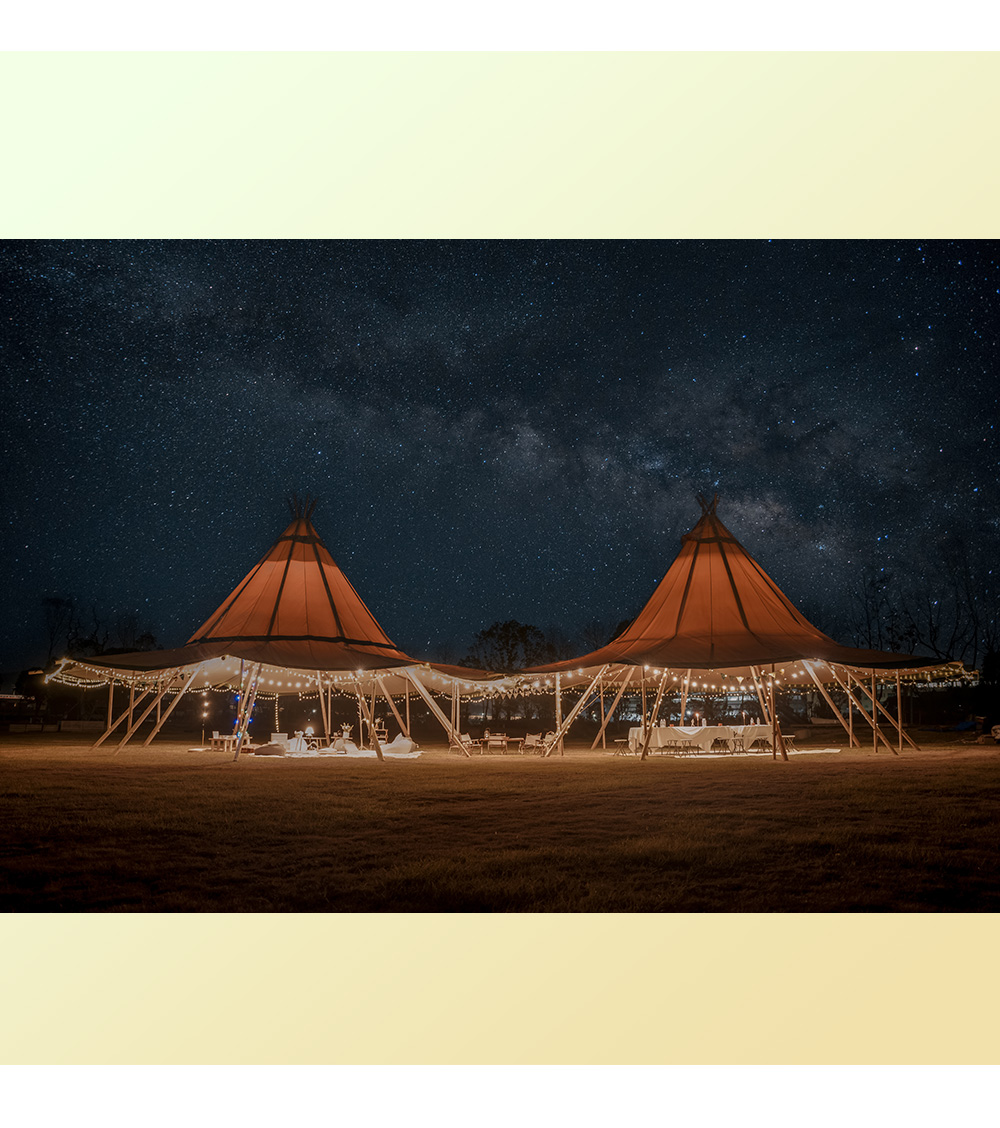 The glam-camp Straw Hat Tent (Tipi Hat) series offers architectural elegance for high-capacity venues. Ranging from 78㎡ to 360㎡, these tents are engineered for resorts, weddings, and corporate events. Crafted from premium 1680D high-denier polyester with a PU coating, they provide industrial-grade protection against UV, mold, and fire.