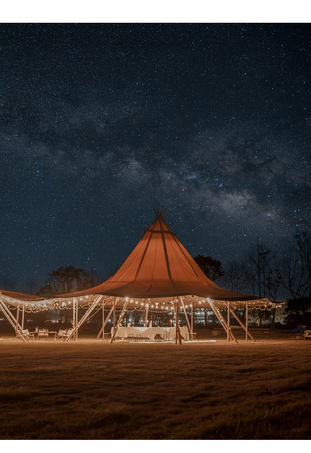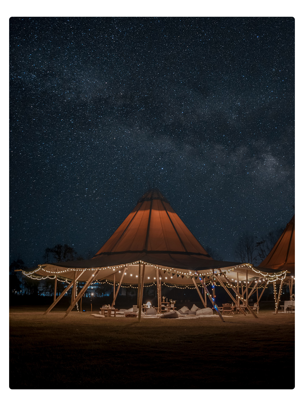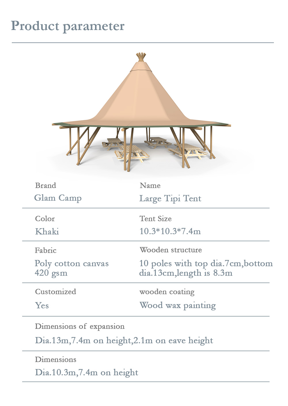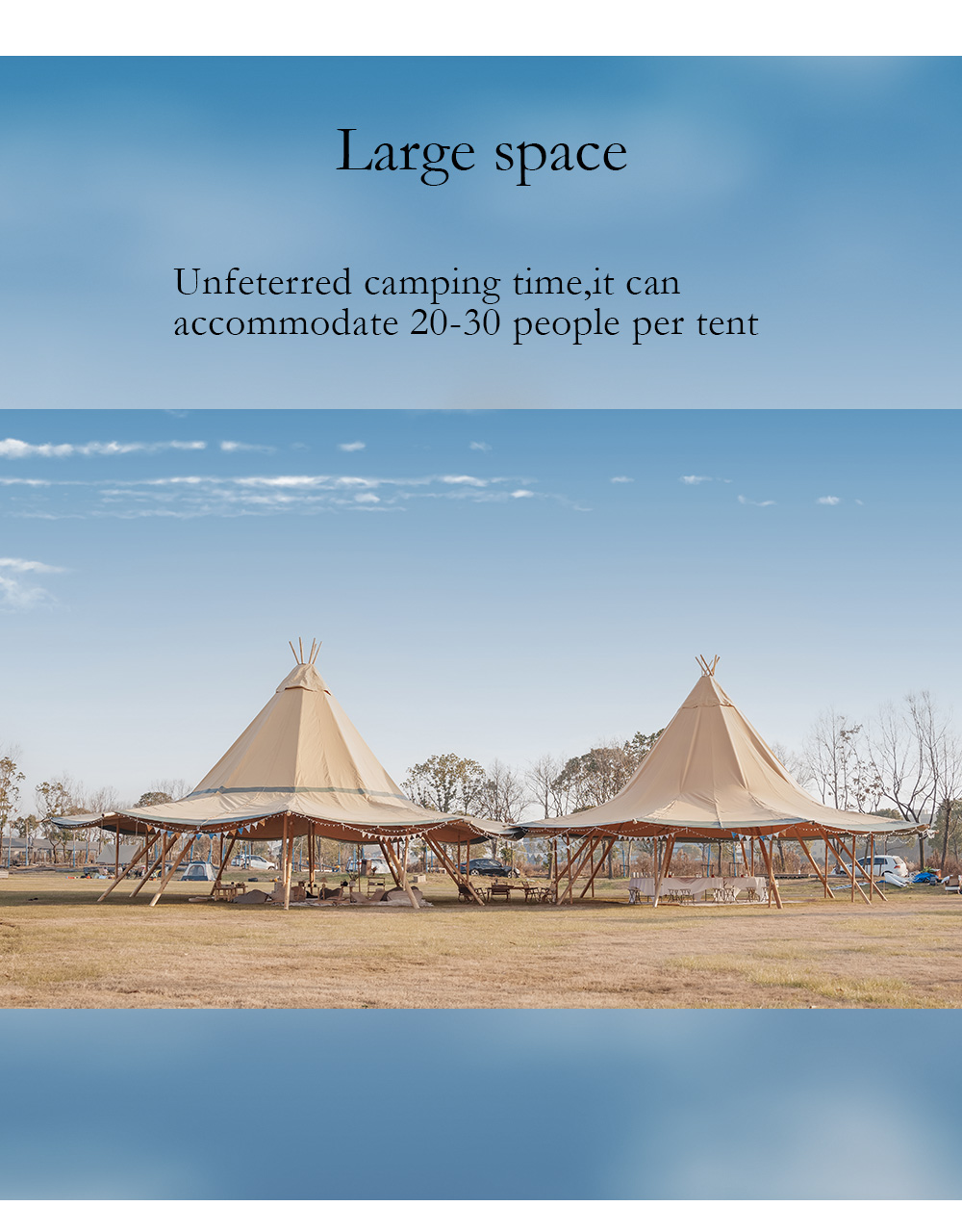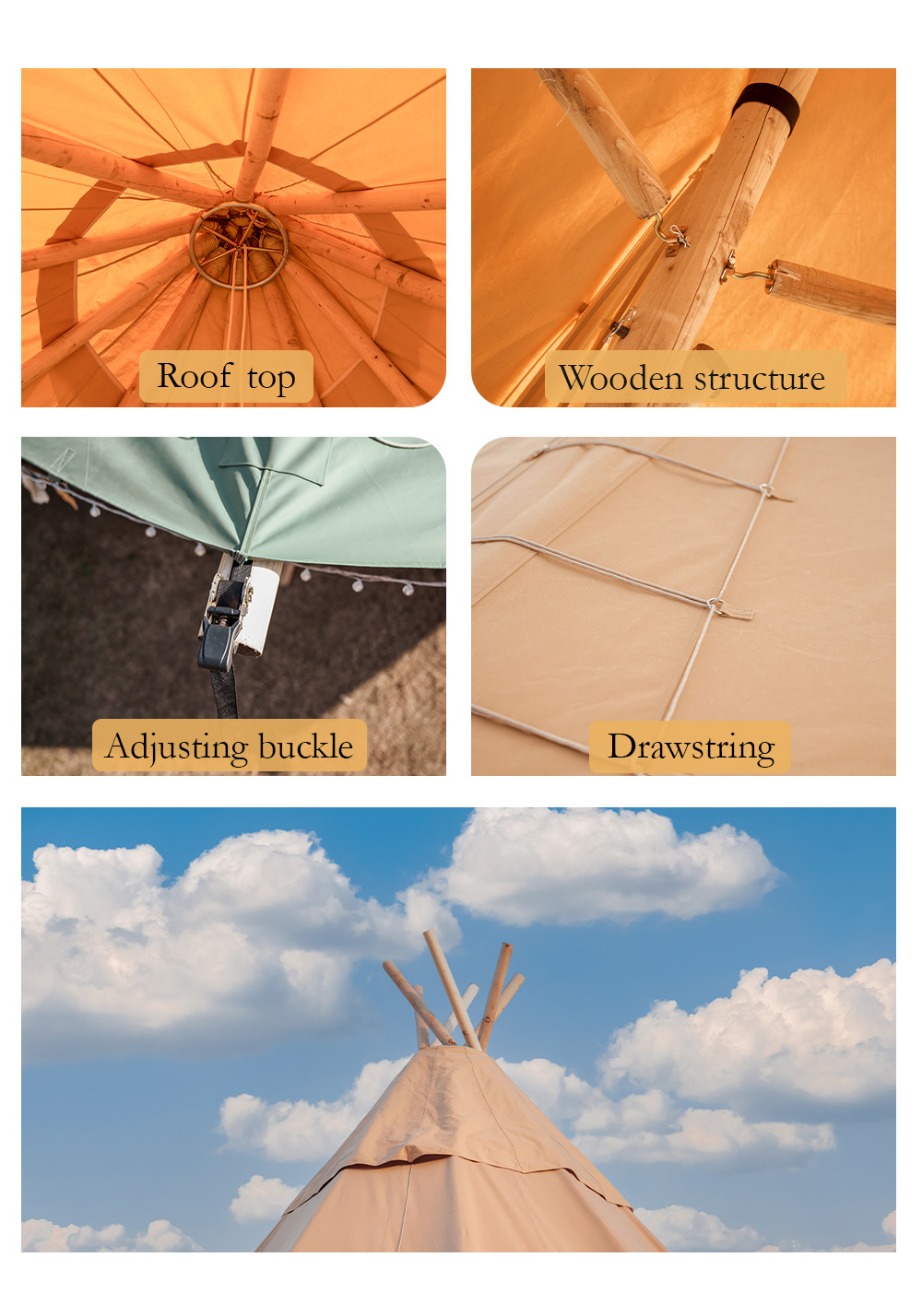 The glam-camp Straw Hat Tent (Tipi Hat) series offers architectural elegance for high-capacity venues. Ranging from 78㎡ to 360㎡, these tents are engineered for resorts, weddings, and corporate events. Crafted from premium 1680D high-denier polyester with a PU coating, they provide industrial-grade protection against UV, mold, and fire.